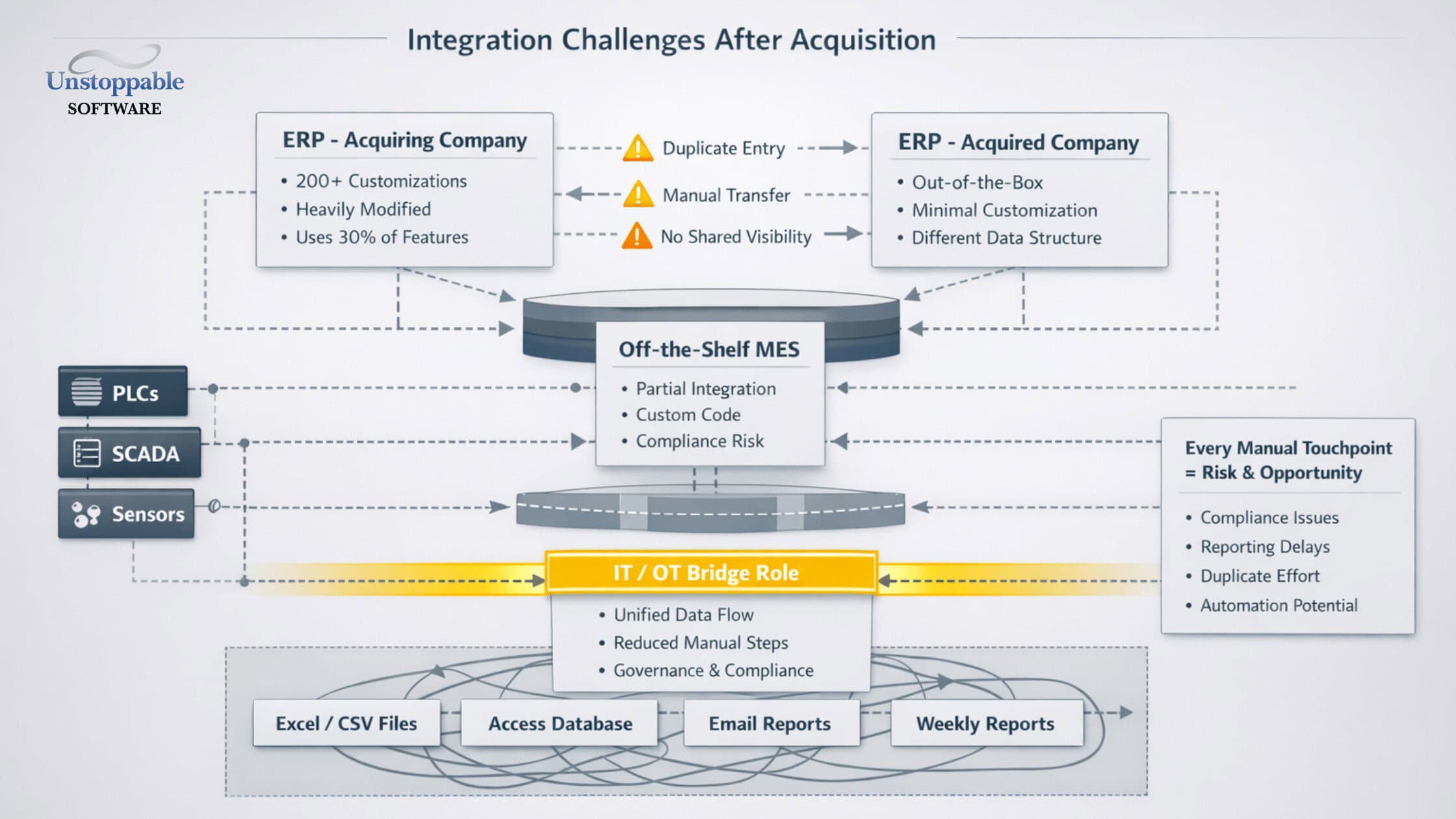 After acquisitions, manufacturers often operate parallel ERPs, layered with off-the-shelf MES and manual workarounds. Each spreadsheet, export, and email report becomes both an operational risk and an opportunity for automation.